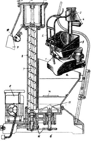 б-разрез: 6 - электродвигатель; 7 - шнек; 8 - вертикальная труба;