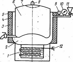 Пищеварочные котлы с косвенным обогревом снабжены контрольно-измерительными приборами и арматурой. К ним относятся: двойной предохранительный клапан 9, манометр 10 (для электрических котлов - электроконтактный), наполнительная воронка 11, кран уровня 12, клапан-турбинка 8.(рис. 2.1)