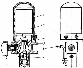 Двойной предохранительный клапан (рис. 2.2) соединен с рубашкой котла и имеет, корпус 5, в котором размещены два клапана: верхний 4 (паровой) и нижний 7 (вакуумный). Паровой клапан служит для сброса давления пара из греющей камеры при повышении его давления выше 49 кПа (0,5 кгс/см2). При повышении давления сверх допустимой величины пар приподнимает клапан, преодолевая усилие груза 3 определенной массы, и излишек пара с шумом выделяется в помещение. Испытывают и клеймят клапаны на заводе-изготовителе. Вакуумный клапан служит для поступления воздуха в рубашку при понижении давления пара в ней ниже атмосферного, что может происходить при остывании котла.