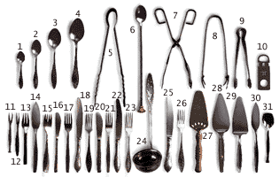 16 и 17 нож и вилка десертные 18 и 19 нож и вилка десертные 20 и 21 нож и вилка закусочные 22 и 23 нож и вилка закусочные 24 ложка разливательная 25 и 26 нож и вилка столовые для вторых блюд (кроме рыбных) 27 лопатка кондитерская 28 лопатка паштетная 29 лопатка рыбная 30 лопатка для икры 31 ложка для мороженого |