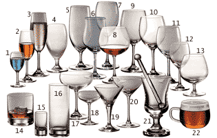 14 стопка для виски 15 стопка для водки 16 фужер для минеральной или фруктовой воды 17 бокал для шампанского 18 рюмка для ликера 19 рюмка для мартини 20 рюмка для коктейля 21 бокал для грога 22 бокал для чая или пунша |