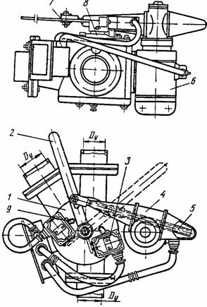 2—рукоятка; 3— конечные переключатели; 4— редуктор; 5—ходовой винт; 6— электродвигатель; 7—болт; 8— пробка; 9—упоры.