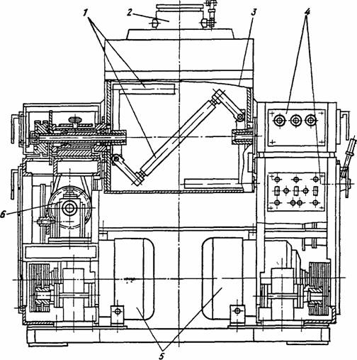 1—месильные органы; 2—крышка; 3—месильная камера; 4—пульты управления; 5—электродвигатели привода месильных органов; 6 — электродвигатели привода поворота камеры.