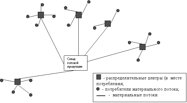 Как уже описывалось выше, используемая предприятием система сбыта имеет всего один распределительный центр – склад готовой продукции. Схематически данная система уже была изображена на рис. 4.1. Более подробное ее изображение, учитывающее реальное количество посредников, дано на рис. 4.4.: