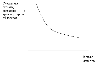 Суммарные транспортные расходы при увеличении количества складов в системе распределения, как правило, убывают. Однако это снижение не носит столь выраженный характер, как снижение расходов на ближние перевозки, так как на форму зависимости влияет увеличение расходов на завоз товаров на склады (при увеличении количества складов).