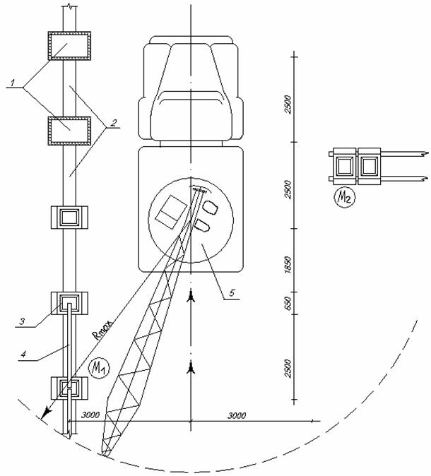 1- котлован под фундаменты; 2 – траншея; 3 – сборный железобетонный фундамент; 4 – сборная железобетонная панель ограды; 5 – автокран КС-2561К-1; М1, М2 - монтажники