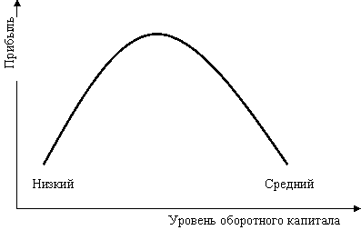 При низком уровне оборотных средств производственная деятельность не поддерживается должным образом, отсюда – возможная потеря ликвидности, периодические сбои в работе и низкая прибыль. При некотором оптимальном уровне оборотных средств прибыль становится максимальной. Дальнейшее повышение величины оборотных средств приведет к тому, что предприятие будет иметь в распоряжении временно свободные, бездействующие текущие активы, а также излишние издержки финансирования, что повлечет снижение прибыли (рисунок 1.3).