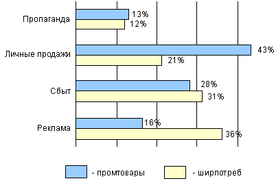 Рис. 1. Пример планирования программы продвижения 13х1 + 43х2 + 28х3 + 16х4 --> max (для ППТН) 12х1 + 21х2 + 31х3 + 36х4 --> max (для ТПС), где х1 , х2 , х3 , х4 , соответствующие затраты на каждый элемент продвижения (PR, персональные продажи, стимулирование сбыта, реклама), а сумма Х-ов есть ни что иное как рекламный бюджет. Таким образом, руководитель, отвечающий за продвижение, должен четко понимать какие методы и ресурсы необходимо задействовать при проведении промоушн-мероприятий и какую роль при этом должна играть реклама. При осуществлении рекламных мероприятий во главу угла должны быть поставлены цели, которые предприятие пытается достичь при использовании этого метода продвижения. Обычно цели рекламной кампании делят на количественные цели и качественные. К качественным целям обычно относят все те результаты, которых хотят добиться в данной конкретной рекламной кампании. Например: