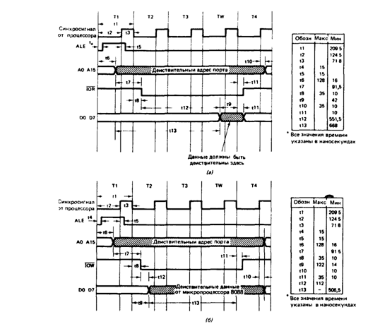 Ключом к успешному созданию любого интерфейса с системой является обеспечение совместимости временного распределения его работы с аналогичными параметрами системной шины. Во временных диаграммах и таблицах, приведенных на рис. 3.5, представлена детальная информация о временном распределении шинных циклов записи и чтения для ВВ.