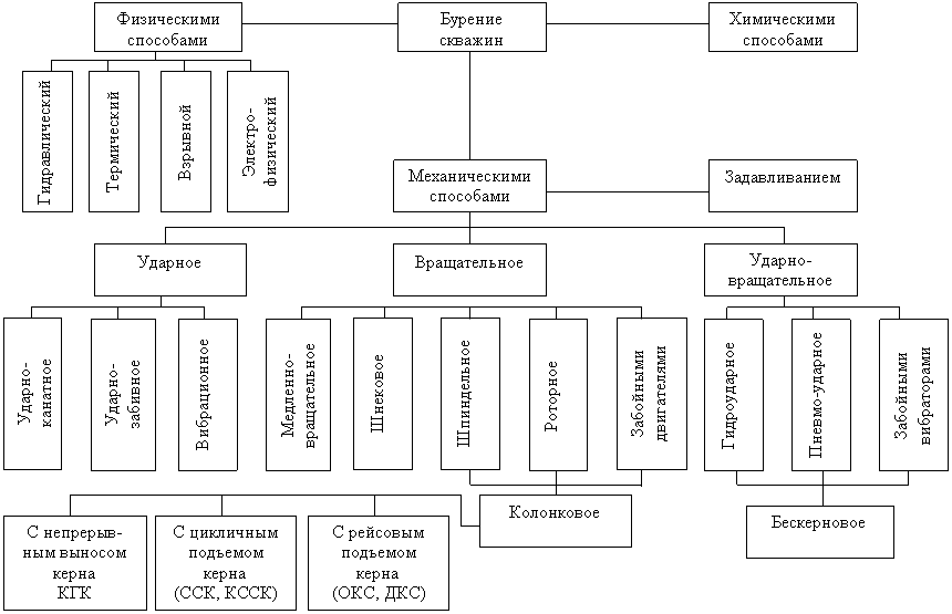 Бурение скважин может осуществляться способами, принципиально отличающимися по своей физической природе разрушения горных пород: механическими, физическими и химическими.