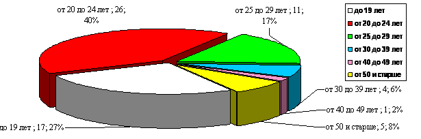 1. По возрасту: до 19 лет (17 чел.); от 20 до 24 лет (26 чел.); от 25 до 29 лет (11 чел.); от 30 до 39 лет (4 чел.); от 40 до 49 лет (1 чел.); от 50 и старше (5 чел).