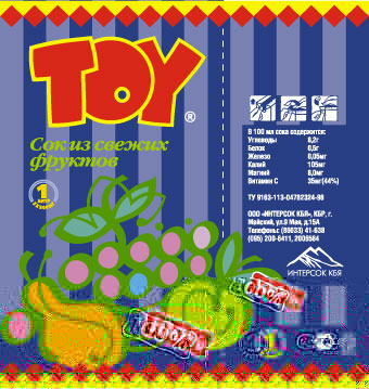 Одной из маркетинговых проблем предприятия является отсутствие узнаваемости продукции, собственного товарного знака. Проведение рекламной кампании делает необходимым разработку упаковки и товарного знака, иначе покупатели, заинтересованные в покупке продукции фирмы, просто не смогут отличить ее среди множества других. К тому же неброская, скромная упаковка может разочаровать их, ведь в рекламе говорится о престижности товара. Рассмотрим на примере сока «TOY», как происходит комплексная разработка упаковки. Фонема. Всем известно, что от названия продукта зависит очень многое. Если оно неблагозвучное, вызывает негативные ассоциации, или просто труднопроизносимо, то это значительно осложнит продвижение продукта на рынке. Фонема — звуковая, фонетическая составляющая логотипа, не зависящая от начертания. Фонема торговой марки в нашем случае является слово «TOY». Графема. Очень важно, чтобы графема (графическая форма логотипа, выраженная характером шрифта, композицией, цветом) соответствовала назначению товара, указывала на его достоинства, соответствовала эстетическим требованиям его целевой аудитории Хотя в переводе с английского TOY — игрушка, предпочтение все же было отдано графеме с яблочком-солнцем в букве «О», обыгрывающей фруктовую тему.