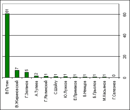 Мы рассмотрим эффективность применения средств массовой информации в PR-деятельности политических партий на примере партии "Единая Россия". Данная партия, по мнению большинства аналитиков, является фаворитом т.к. она позиционируется как партия власти, которую поддерживает президент, чей рейтинг очень высок. (см. рис. 1).
