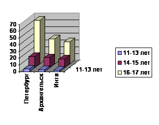 Важным звеном в развитии алкоголизации школьников является приобщение их к алкогольным обычаям семьи (рис. 1). Как видно из иллюстрации, в отношении употребления спиртных напитков в семье, во всех трех городах и у мальчиков, и у девочек наглядно прослеживается прямая зависимость частоты алкоголизации в семье от "уровня урбанизации" (с максимальными показателями во всех возрастных группах по Петербургу).
