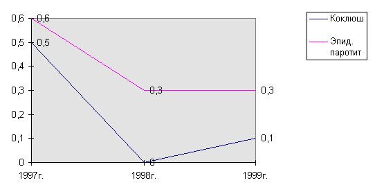 По данным таблицы отмечается рост общей инфекционной и паразитарной заболеваемости в 1999 году в 1,4 раза по сравнению с 1998 годом, преимущественно за счет увеличения неуправляемых воздушно-капельных инфекций. В 1998 году отмечалась вспышка ветряной оспы практически во всех ДДУ, рост её по сравнению с 1998 годом в 4 раза, также повысилось заболеваемость коревой краснухой почти в 2 раза. За это же время отмечается снижение заболеваемости скарлатиной в 3 раза. Среди управляемых инфекций за последние 3 года отмечались единичные случаи эпид. паротита и коклюша, причем заболеваемость коклюшем в 1999 году ниже в 5 раз чем в 1997 году, а эпид. паротитом в 2 раза. В 1997 году отмечались 2 случая носительства коринебактерий дифтерии, а заболеваемости дифтерией и корью в течении трех лет в отделении не отмечалось. Это говорит об эффективности проводимой вакцинопрофилактики и о хорошем иммунитете у детей к этим грозным заболеваниям.