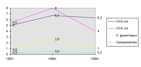 В 1999 году заболеваемость ОКИ установленной теологии снизилась в два раза, а острой дизентерии 2,6 раза по сравнению с 1998г.