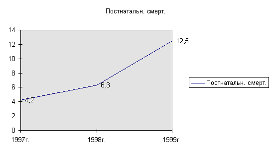 К сожалению, за последние три года постнатальная смертность в отделении имеет тенденцию к росту как в целом по городу и улусу, что видно в диаграмме.