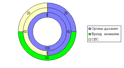 Как видно из таблицы и диаграммы в структуре причин младенческой смертности за последние три года ежегодно отмечаются по одному случаю по причине болезней органов дыхания, за последние два года по одному случаю синдрома внезапной смерти, в 1999 году 2 случая от врожденных пороков развития. В случаях смерти детей по причине болезней органов дыхания во всех случаях имело место иммуннодефицитное состояние: в 1997 году у ребенка 7 месяцев умершего от геморрагической вирусной пневмонии отмечались тимомегалия с гипоплазией надпочечников; в 1998 году у ребенка 4 месяцев отмечалась ОРВИ гриппозной этиологии с развитием синдрома Рея (токсическая энцефалопатия с развитием комы, отека головного мозга и поражение печени в виде жировой дистрофии), который дает высокую смертность, и все это на фоне врожденного иммуннодефицитного состояния; в 1999 году у ребенка 5 месяцев ОРВИ, гнойный лептоменингит на фоне истощения иммунных механизмов и при наличии сопутствующего диагноза - врожденный порок сердца (тетрада Фалло).