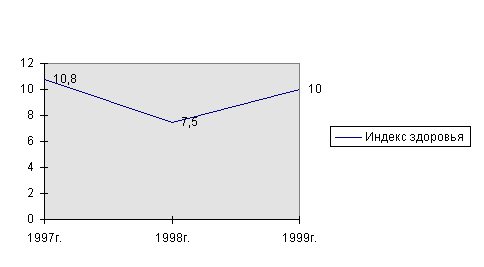 Из таблицы видно, что общая заболеваемость и заболеваемость детей до 1-го года остается высокой все годы, несколько выше Республиканских показателей. Отмечается рост инфекционной заболеваемости в 1999 году за счет неуправляемых инфекций. Заболеваемость управляемыми инфекциями незначительная (коклюш 0,1%0, эпид. паротит 0,3%0), что говорит о хорошем охвате детей проф. прививками. Индекс здоровья в пределах 10%.