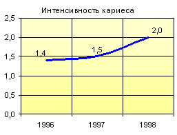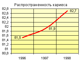 Показатель распространённости кариеса на участке увеличивается с 81,5 % (1996-1997 гг.) до 82,7 % (1998-1999 гг.), оставаясь ниже показателя отделения. Прирост кариеса на участке в 1996-1997 гг. был ниже показателя отделения, а в1998-1999 гг. сравнялся с ним. Наблюдается увеличение интенсивности кариеса с 1,4 (1996-1997 гг.) до 2,0 (1998-1999 гг.) при ежегодном показателе по отделению 2,2.