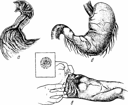 а, б — гипертрофия мышц привратника; в — антиперистальтическая волна