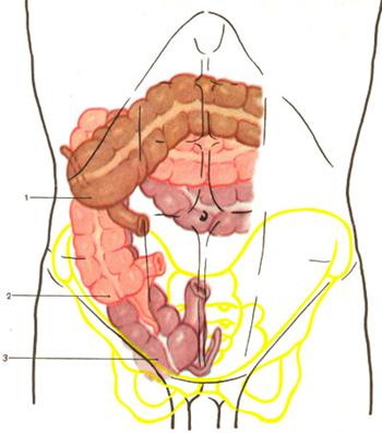 1 — подпеченочное; 2 — подвздошное; 3 — тазовое.
