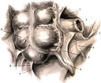 1 — recessus ileocaecalis superior; 2 — ileum (отсечена); 3 — recessus ileocaecalis inferior; 4 — ureter dexter; 5 — mesenteriolum appendicis vermiformis; 6 — appendix vermiformis; 7 — recessus retrocaecalis; 8 — plica retrocaecalis; 9 — caecum.