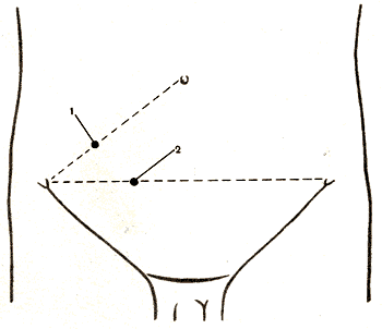 Проекция, положение, синтопия. Проекция основания отростка на переднюю брюшную стенку весьма непостоянна. Наиболее часто основание проецируется на границе средней и правой трети lin. biiliaca (точка Ланца) или на границе нижней и средней трети линии, соединяющей пупок с передней верхней остью подвздошной кости (точка Мак Бурнея) (рис.4). Значительно реже основание отростка проецируется на переднюю брюшную стенку в других точках надчревной, чревной и подчревной областей. В одних случаях эта проекционная точка находится на различных уровнях срединной линии живота, в других — у правого подреберья, на уровне паховой связки и т. д. Непостоянство положения червеобразного отростка является одной из причин диагностических ошибок при его воспалении.