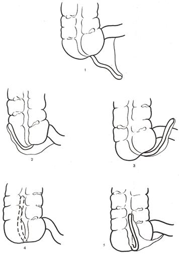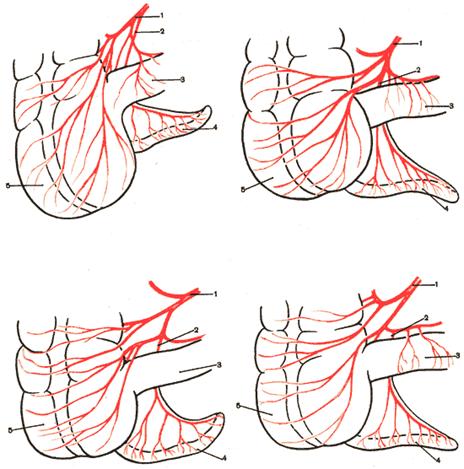 1 — нисходящее; 2 — боковое (латеральное); 3 — внутреннее (медиальное); 4 — заднее (ретроцекальное, дорсальное); 5 — переднее (вентральное).