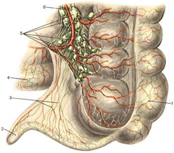 1 — caecum; 2 — appendix vermiformis; 3 — лимфатические сосуды брыжейки червеобразного отростка; 4 — ileum; 5 — илеоцекальные узлы; 6 — a. ileocolica.