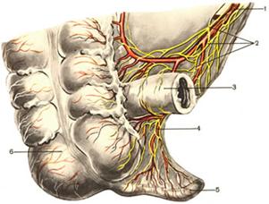 1 — a. ileocolica; 2 — нервные ветви plexus mesenterici superioris; 3 — ileum; 4 — a. appendicis vermiformis; 5 — appendix vermiformis; 6 — caecum.