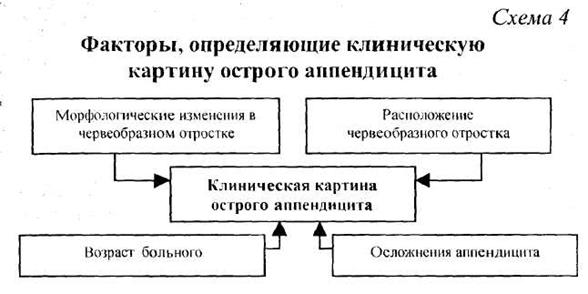 Как видно на схеме 4, клиническая картина острого аппендицита зависит от характера воспалительного процесса (морфологических изменений) в червеобразном отростке. Клиническая практика показывает, что чем больше тканей червеобразного отростка вовлекается в воспалительный процесс, тем более выражен болевой симптом, тем больше симптомов, выявляющих наличие воспалительного процесса в области слепой кишки, удается обнаружить при обследовании брюшной полости.