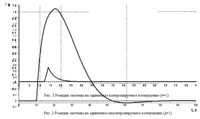 Реакция системы на единичное входное воздействие при данных настройках регулятора приведена на рис. 1. Реакция системы на единичное неконтролируемое возмущающее воздействие приведена на рис. 2. Реакция системы на единичное контролируемое возмущение приведена на рис. 3.