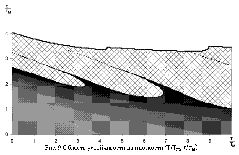 По рис. 8 можно определить направление расширения области (в сторону "гребней"), в которой, при увеличении интервала моделирования, переходный процесс успеет завершится. Во всех остальных областях устойчивости наблюдается аналогичная картина – лучеобразное расширение области при увеличении интервала моделирования (например, рис. 9 – область устойчивости (T/Tм; t/tм)).