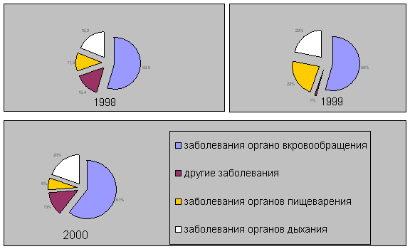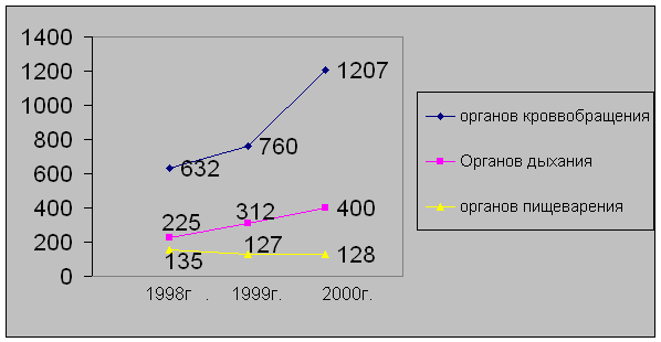 Из таблицы № 5, из графика № 1 и диаграммы № 2 сделаем вывод, что наибольшее число пролеченных больных приходится на заболевания органов кровообращения, которые растут с каждым годом. (в 2000г. таких больных пролечено почти в два раза больше, чем в 1998г.) Это зависит от экологических, экономических и социальных условий, в которых мы живем. Люди все больше подвергаются нервно-психическим напряжениям, стрессам. Неумеренное, нерациональное питание, чрезмерное употребление соли также приводит к росту сердечно-сосудистых заболеваний. Вредные привычки: курение и алкоголь наносят свой удар ССС.