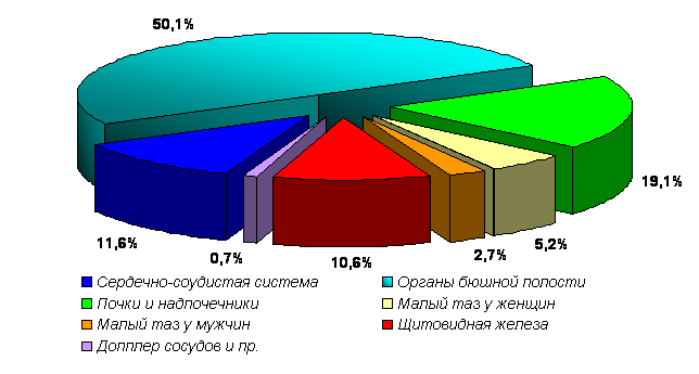 В последние 3 года по общему количеству исследований и отдельно по каждому виду исследований сложилась в общем стабильная ситуация: колебание цифр незначительное - в пределах 5-8 %, и зависит в основном от потребностей и от поломок аппаратуры. Уменьшилось количество УЗИ органов малого таза у женщин, что связываю с кадровыми переменами в ГДЦ: в период отсутствия гинеколога и в период работы гинеколога на 0,5 ставки направлений на УЗИ было мало, в последние два месяца года их количество значительно увеличилось.