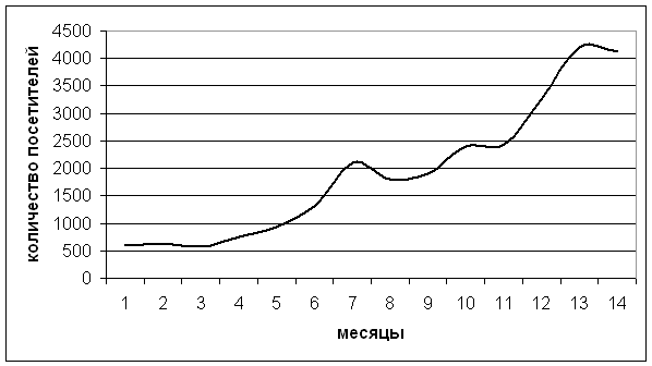 Перед сотрудниками отдела рекламы была поставлена задача вывить Интернет-ресурсы с потенциально-целевыми посетителями, разместить рекламу, а также рекламировать сайт всеми возможными способами. За год активной рекламы корпоративного сайта ПО «ХимСтальКомплект» было достигнуто постепенное увеличения видимости сайта в Интернет для пользователей и увеличения посетителей сайта в среднем с 25 до 200 человек (рисунок 13).