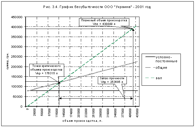На основании данных, представленных в табл. 3.9, и уровня цены предприятия на единицу продукции, построим график безубыточности (рис. 3.4) с целью определения критического объема производства и запаса финансовой прочности ООО «Украина»
