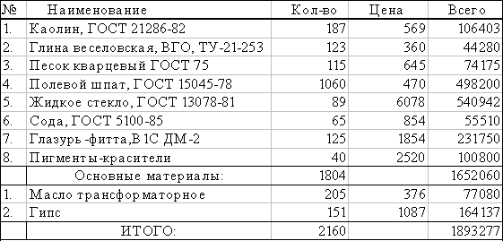 Для выпуска первой партии продукции потребуются сырьё и материалы на сумму 1.893.277 руб. в количестве 2.160 кг. (таблица 2). Поставщиками сырья, материалов и концентратов являются завод керамических изделии.