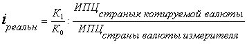 Уровень инфляции может быть учтен также в индексе номинального эффективного валютного курса ( Iэф ) путем умножения каждого индивидуального индекса валютного курса ( i ) на отношение индексов цен страны валюты-измерителя и страны котируемой валюты. Исчисленный так индекс называют индексом реального эффективного валютного курса ( Iреальн.эф. ).