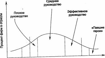 На рис. 2 показано, как распределяется поведение компаний в отрасли по степени агрессивности. Поведение небольшого числа фирм характеризуется минимальным уровнем агрессивности («на уровне банкротства»), при котором еще возможно получение прибыли, что связано с таким же низким уровнем менеджмента. На противоположной стороне («эффективное руководство») находятся агрессивные компании, чья реакция соответствует уровню турбулентности среды. Такие фирмы имеют наибольшие шансы на успех.