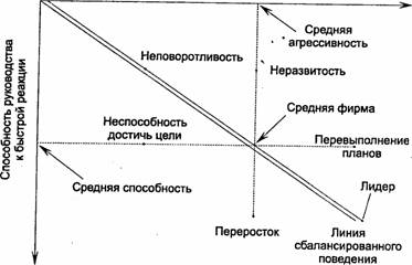 Другой тип несбалансированного поведения присущ компаниям, расположенным на горизонтальной пунктирной линии. Их агрессивность может быть и выше, и ниже среднего уровня, но управленческие способности достаточны для получения средних, сбалансированных результатов.