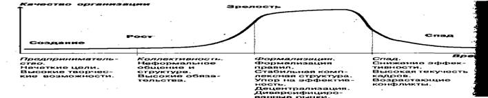 Рис. . Жизненный цикл организации Жизненный цикл ориентирует на периодическую перепроверку специфических целей организации, на постановку вопроса о целесообразности ее существования в том виде, в каком она создавалась первоначально. . Стадия создания организации Организация находится в стадии становления, цели — недостаточно четкие. Творческий процесс протекает свободно. Основные усилия направлены на создание продукта и на выживание в условиях рынка. Организация маленькая, отношения между сотрудниками неформальные. Структура простая, плоская, нет разделения труда и специализации. Работа выполняется совместно. Контроль основывается на личном наблюдении владельца. Он же несет всю ответственность за принятые решения. На этой стадии перед организацией стоят две задачи:• доступ к необходимым ресурсам;• овладение механизмом конкуренции. Решение задан на «стадии создания» невозможно без анализа сложившейся ситуации, без получения всей необходимой информации. На стадии создания организации руководитель должен: изучить потребительский спрос на данную продукцию или услуги на конкретных рынках; собрать и оценить информацию о деятельности и намерениях конкурентов, сопоставить ее с возможностями, наличием ресурсов и стратегией своей компании; взвесить необходимость и целесообразность увеличения потенциала своей компании и внесения соответствующих корректив в ее стратегию; принять необходимые меры по привлечению дополнительных ресурсов за счет внутренних и внешних источников; рационально организовать управленческий процесс, включая расстановку кадров, создание системы ответственности, надежный механизм принятия решений, систему мотиваций и стимулов. Стадия роста организации На этой стадии развиваются инновационные процессы предыдущего этапа, формируется миссия (предназначение) организации. Коммуникации и контроль в организации остаются неформальными. Ее члены затрачивают на работу много времени, демонстрируют коллективность и высокие обязательства. Однако, когда организация начинает быстро расти, появляется необходимость в выделении некоторых видов деятельности, делегировании полномочий, иерархии ответственности, тогда же начинается процесс разделения труда и специализации. На данной стадии перед организацией стоят следующие задачи: