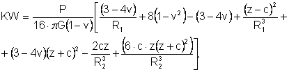 При формировании коэффициентов глобальной матрицы влияния, отражающих зависимость перемещения точки наблюдения (i), когда источник возмущения находится в точке (j) используется решение Миндлина для силы приложений внутри упругого полупространства. Иногда для зависимости, когда действует единичная сила, эти решения называют фундаментальными. Для вертикальной силы Рв=1 зависимость для перемещений KW, когда точка наблюдения имеет координаты В(z,r), а источник возмущения находится на оси Z (радиальная координата равна нулю) на глубине с, запишется в виде:
