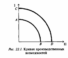 Взаимодействие ресурсов хорошо выражается кривой производственных возможностей Увеличение объема ресурсов и повышение их роста качества за счет НТП приведет к смещению кривой производственных возможностей из положения АВ в положение CD. Если кривая производственных возможностей АВ (или CD) рассчитана с учетом нормативного использования производственных мощностей, то ее можно назвать номинальной кривой. Реальная кривая будет находиться внутри кривой АВ (или CD), так как на практике не бывает полного использования ресурсов экономического роста.