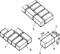 Для кладки применяют целые кирпичи, а также трехчетверки, половинки и четвертки. По конструктивным и технологическим особенностям кирпичную кладку разделяют на сплошную, облегченную, армированную, декоративную, кладку с облицовкой. Кирпичи и камни в ряду кладки, уложенных вдоль стен, называют верстами.