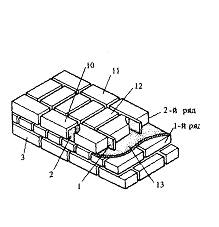 1 — вертикальный продольный шов, 2 — поперечный вертикальный шов, 3 — фасад, 4 — тычок, 5 — постель, 6,8 — ложок, 7 — тычковый ряд, 9 — ложковый ряд, 10 — наружная верста, 11 — внутренняя верста, 12 — забутка, 13 — горизонтальный шов (постель).