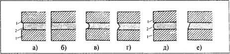 а — заглубленная, б — в подрезку, в — расшивка выкружкой, г — треугольная двухсрезная, д — расшивка выпуклая валиком наружу, е — односрезная; 1 — кирпич, 2 — шов.