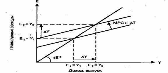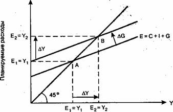 На рис.2 показано, что при росте государственных расходов кривая планируемых расходов сдвигается вверх на величину, равную ΔG, равновесие перемещается из точки А в точку В, объем производства увеличивается с У1 до У2, на величину ΔУ, причем ΔY > ΔG: