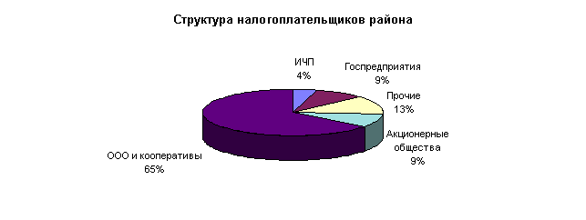 Анализ таблицы 2.6 показывает, что в структуре налогоплательщиков района значительно преобладают предприятия малого и среднего бизнеса - общества с ограниченной ответственностью и кооперативы, по которым наблюдается стабильное увеличение численности этих предприятий за счет вновь регистрируемых обществ. Как показывает практика - это наиболее распространенная организационно-правовая форма предприятия. Доля государственных предприятий и акционерных обществ приблизительно одинакова и составляет в среднем по 9 % от общего числа налогоплательщиков (диаграмма 2.7). Причем по госпредприятиям наблюдается относительная стабильность, а по акционерным обществам плавное увеличение численности и доли в структуре, что объясняется появлением новых акционерных обществ в районе.